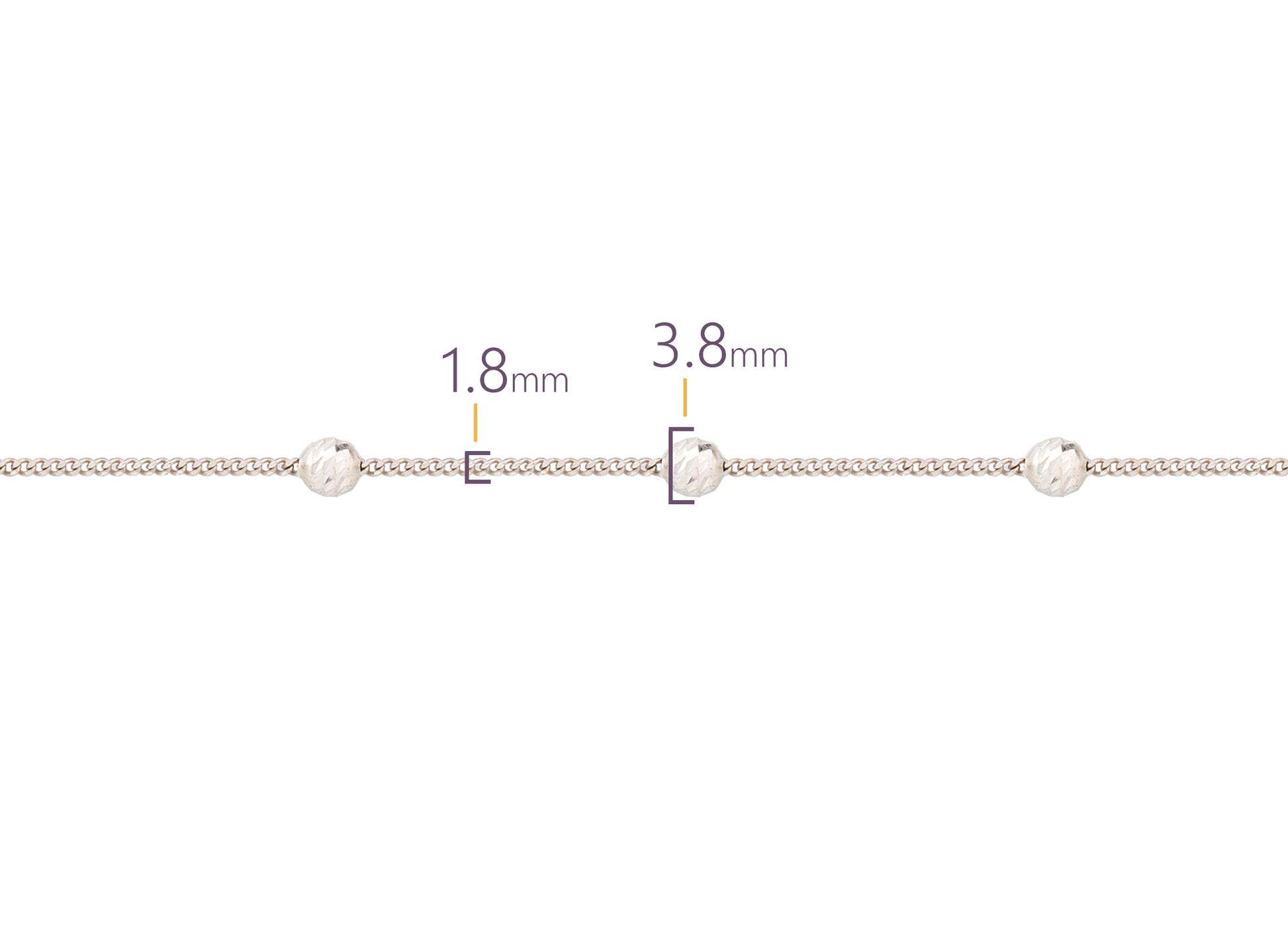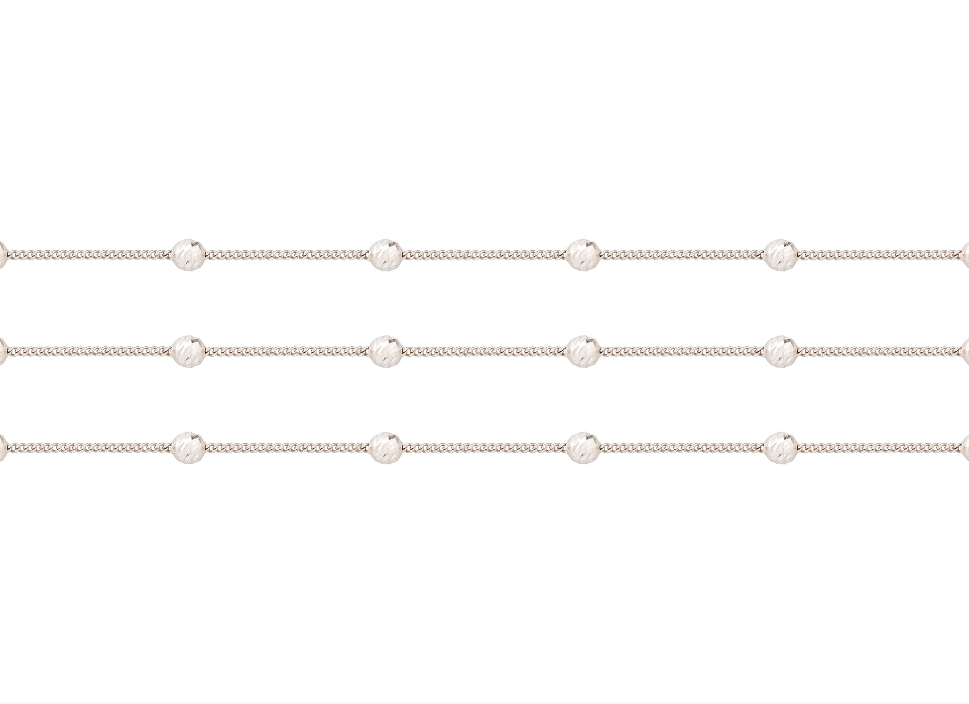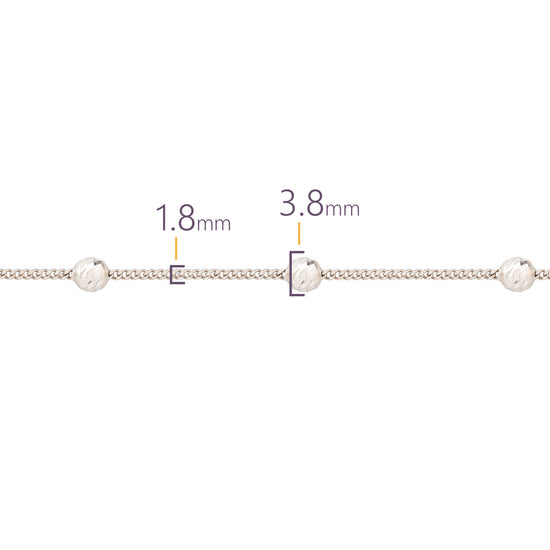 This dainty satellite chain is crafted with 0.69mm wire and 1.8mm links, adorned with 3.8mm beads. Perfect for creating delicate, timeless jewelry pieces and permanent jewelry.