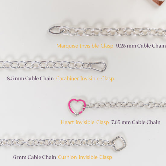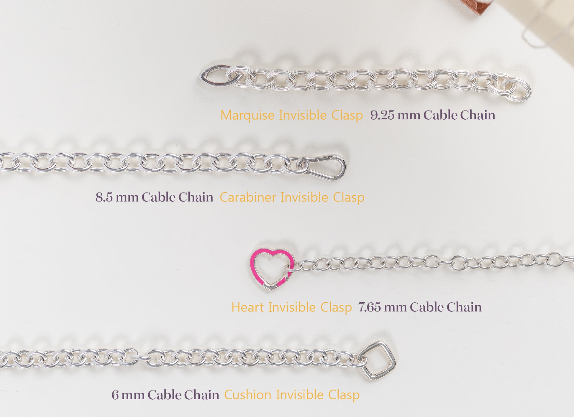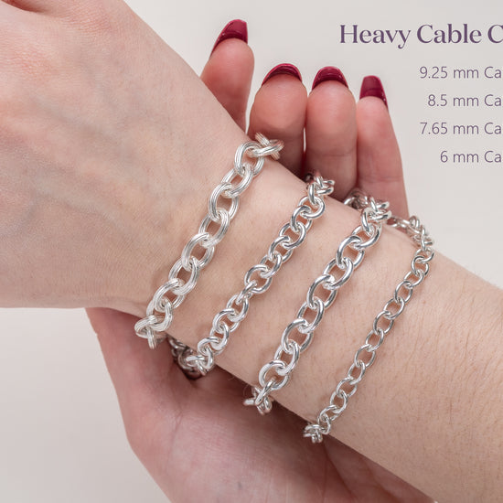 Heavy cable chain available in Sterling Silver. Perfect for both men's and women's jewelry, this stunning chain features large semi-elongated links (7.65mm x 8.5mm) made from thick 1.75mm wire. This chain is compatible with RIVA's Invisible Clasps.