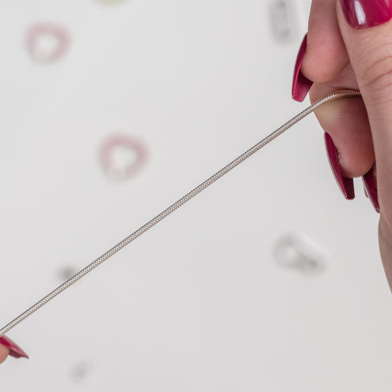 This sterling silver snake chain features smooth, flexible 1.63mm links that form a sleek, contoured design. The chain’s fluid, polished texture gives it an elegant, sophisticated appearance, perfect for creating a simple yet refined jewelry piece.