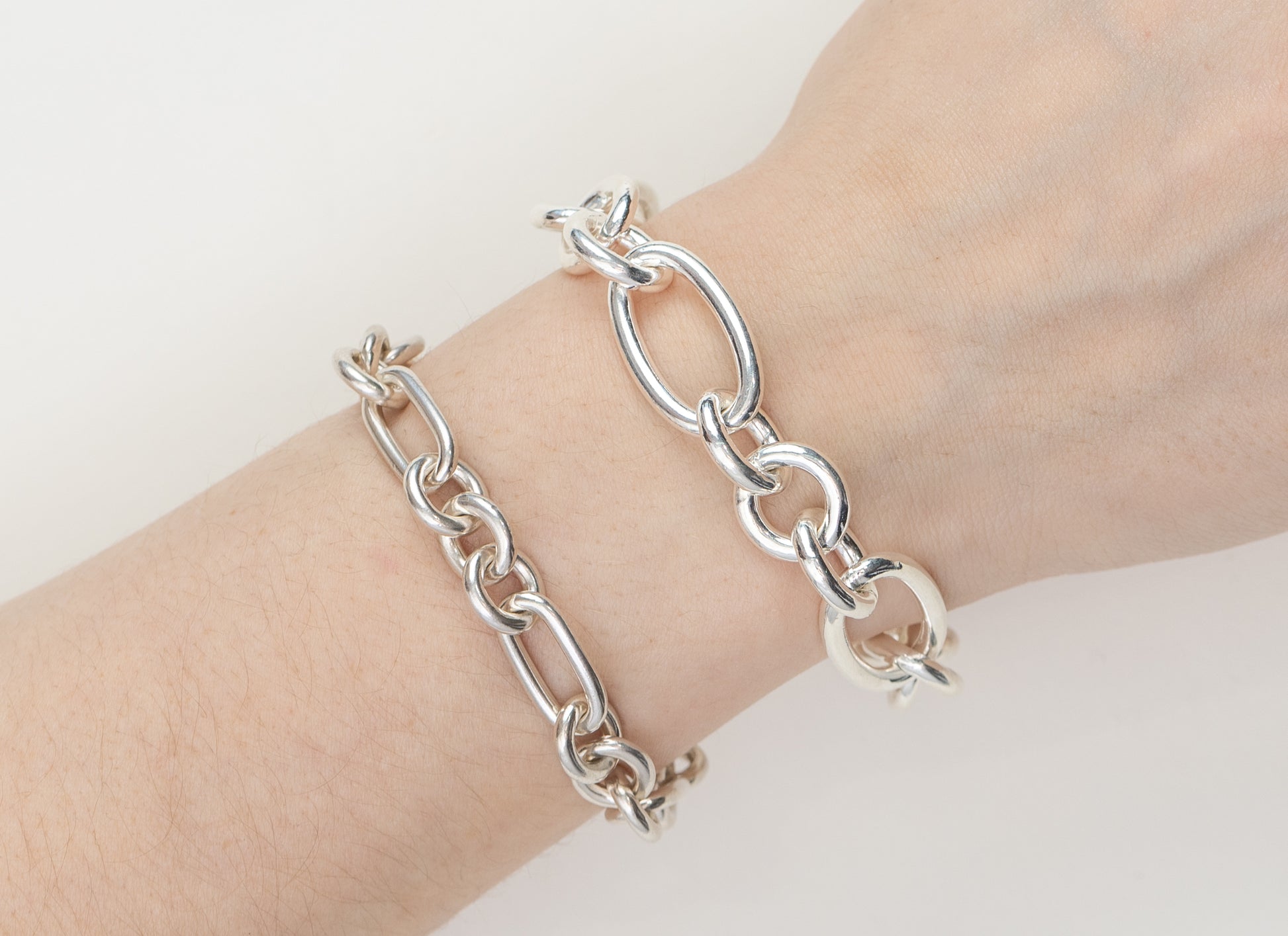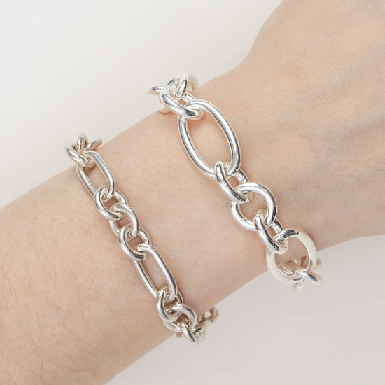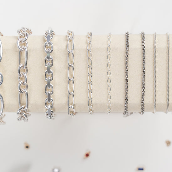 This sterling silver Figaro chain features a striking combination of 14.6mm long links and 6mm shorter links, crafted with a 3mm wire. The alternating link design gives this chain a bold, elegant look.