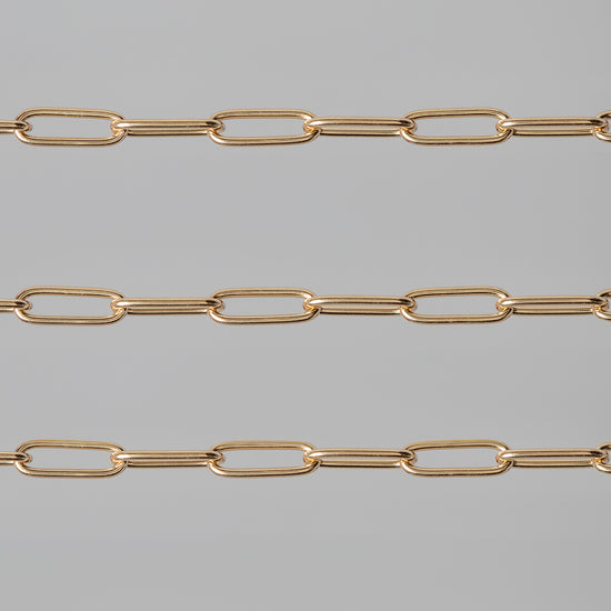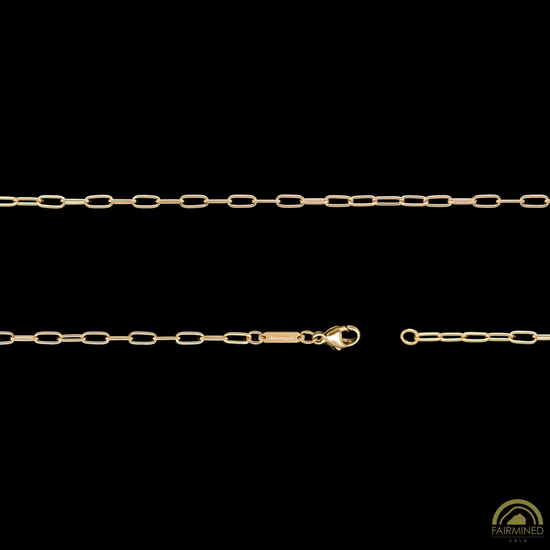 Delicate and lustrous paper clip chain in 14K Fairmined yellow gold for jewelry application, featuring small 2.6mm x 5.7mm links fashioned from round wire. Finished sizes come with lobster claw clasps, jump rings, and tags with the FAIRMINED stamp.