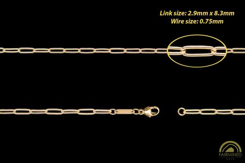 Ultra-versatile 14K Fairmined yellow gold chain for jewelry application, featuring small elongated paper clip-style links fashioned from 0.75mm round wire. Finished sizes come with lobster claw clasps, jump rings, and tags with the FAIRMINED stamp.