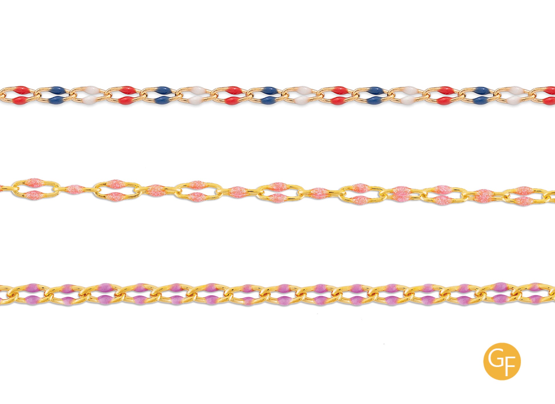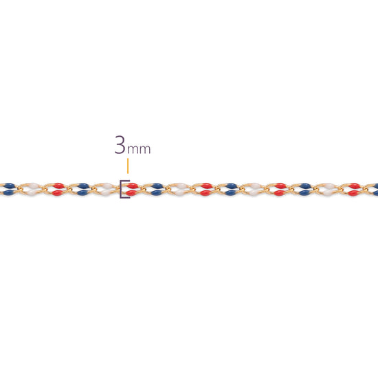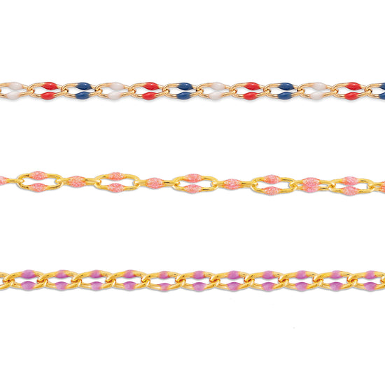 Crafted from 0.50mm 14K gold-filled wire, the 3mm Enameled Paperclip Chain features 3mm x 5.2mm paperclip-style links accented with vibrant enamel. Available in three playful finishes, this chain adds shimmer, color, and modern style to permanent jewelry, bracelets, or necklaces.