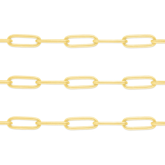 Introducing our high-polish chain crafted in yellow, rose, or white gold (available in 14K or 18K), designed specifically for necklaces, bracelets, and anklets. This chain boasts large, chunky paper clip-style links with rounded edges, creating a bold and stylish look. Each link measures a substantial 5.2mm x 14.6mm, adding a statement-making touch to your jewelry creations. Finished sizes come with lobster claw clasps and jump rings. Tags are not included; if you would like to request for finished chains with tags bearing an engraving of your logo, please contact us to place a special order.