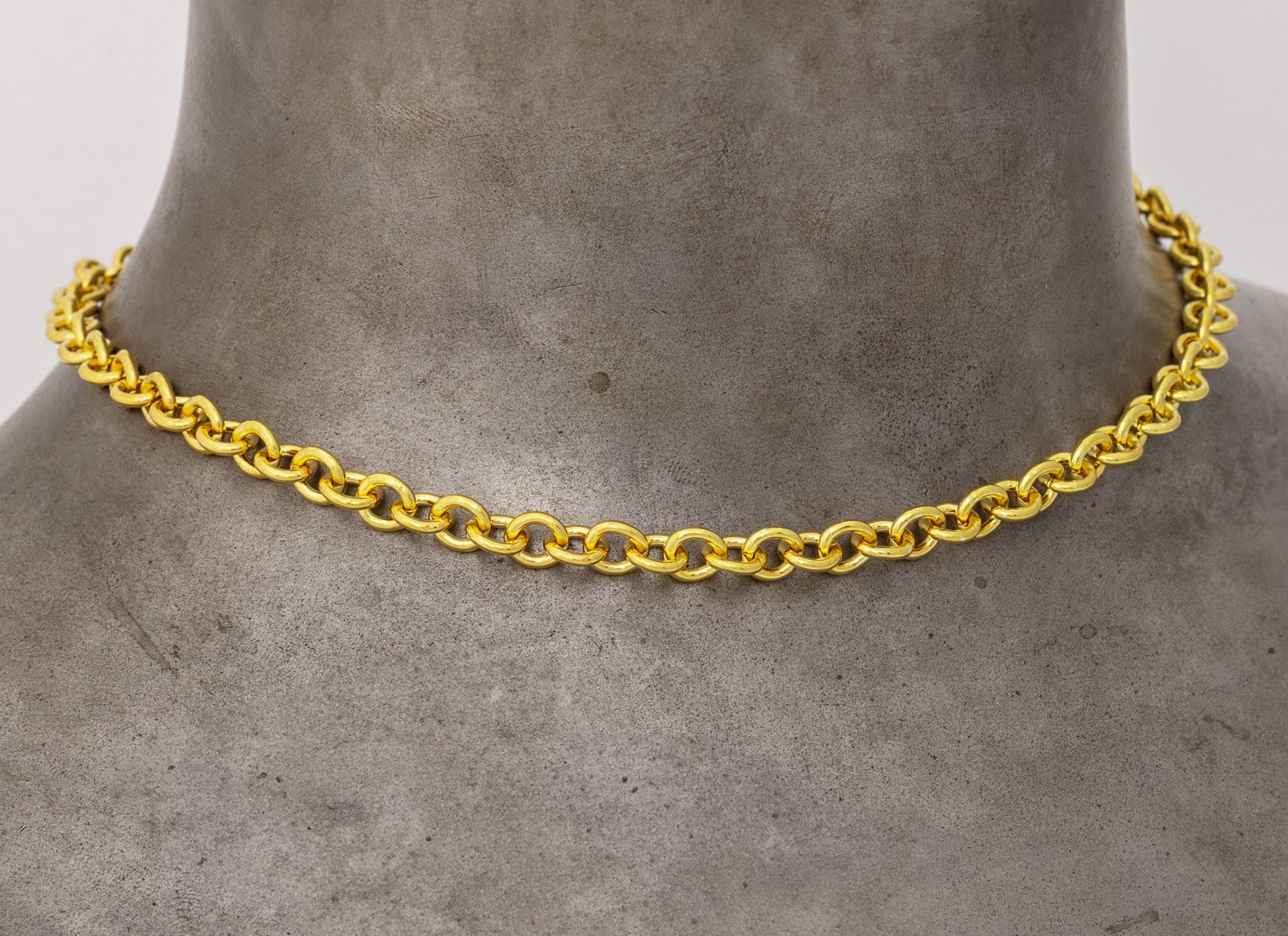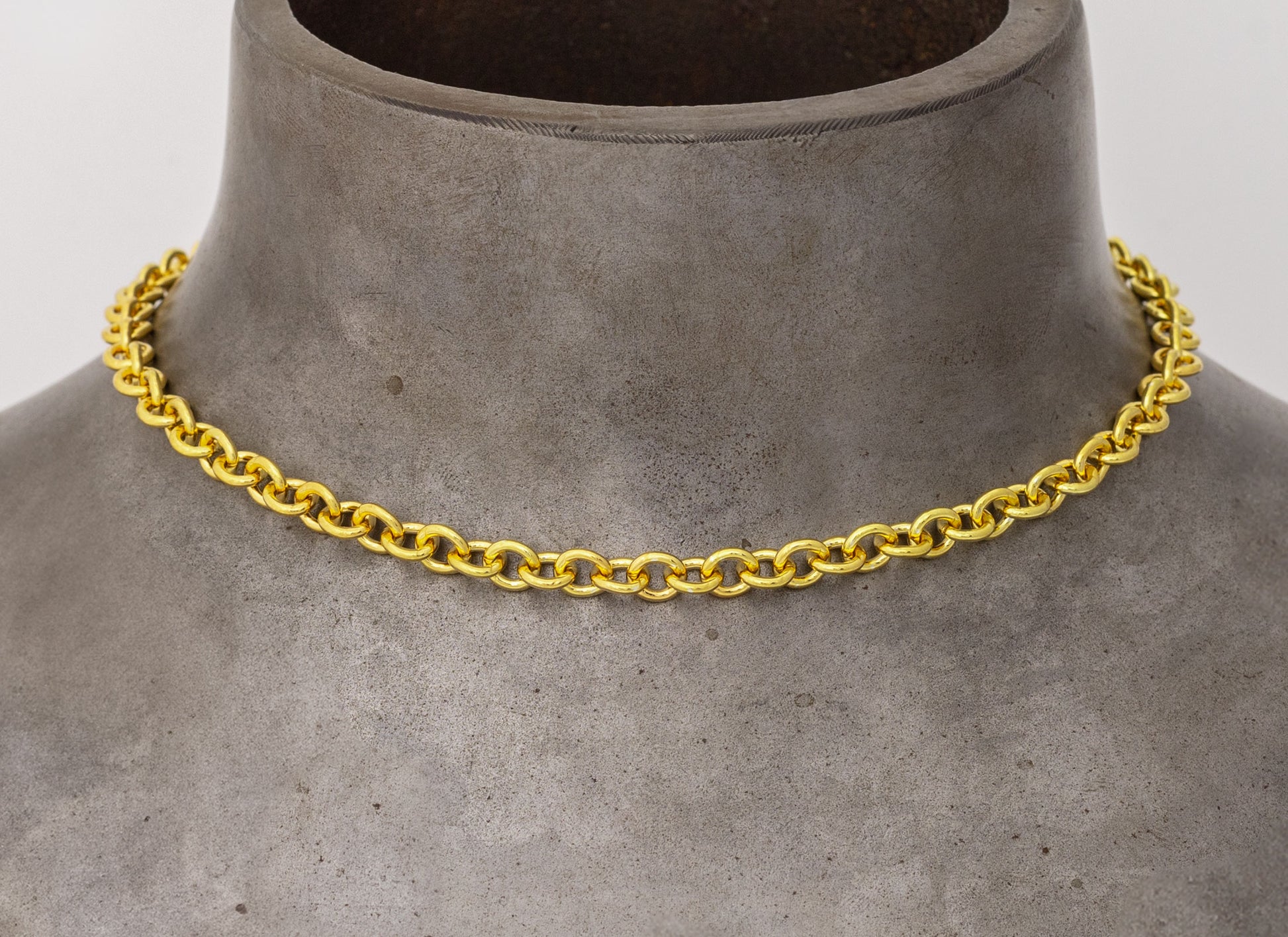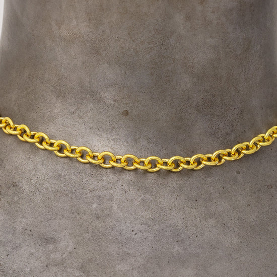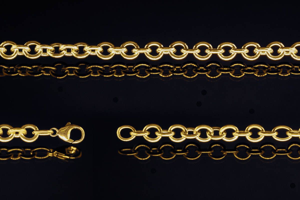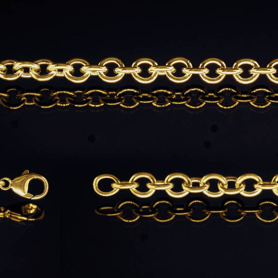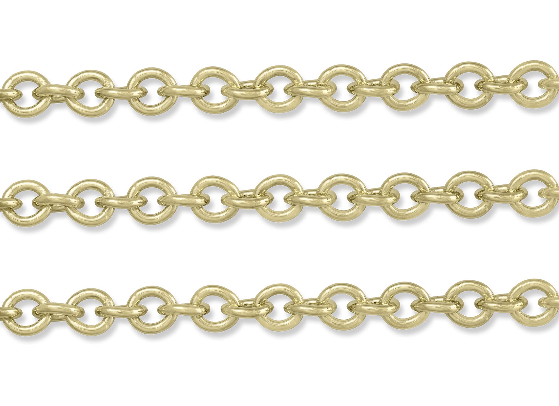 Heavy cable chain in high-polish 14K and 18K gold, featuring large 6.06mm x 6.7mm links made from 1.35mm wire. The finished chain includes an 11mm lobster claw clasp and jump rings. Please note that tags are not included.