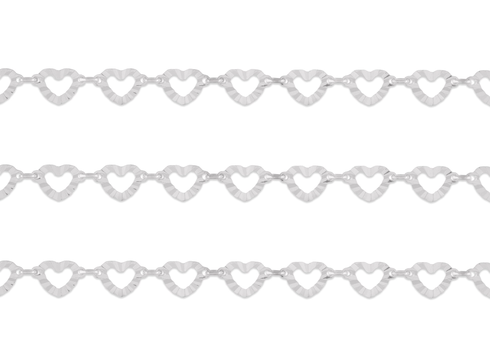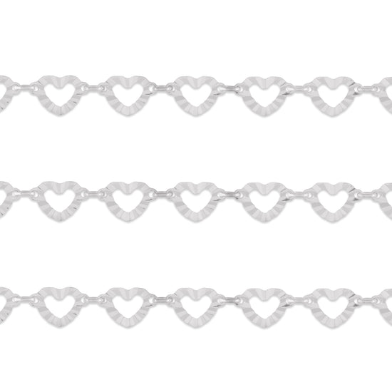 This sterling silver chain features hammered heart links connected by small jump rings, adding a distinctive touch to any design. Each heart measures 8.82mm x 5.89mm. Sold by the inch in 12-inch increments, it’s perfect for creating unique jewelry pieces.
