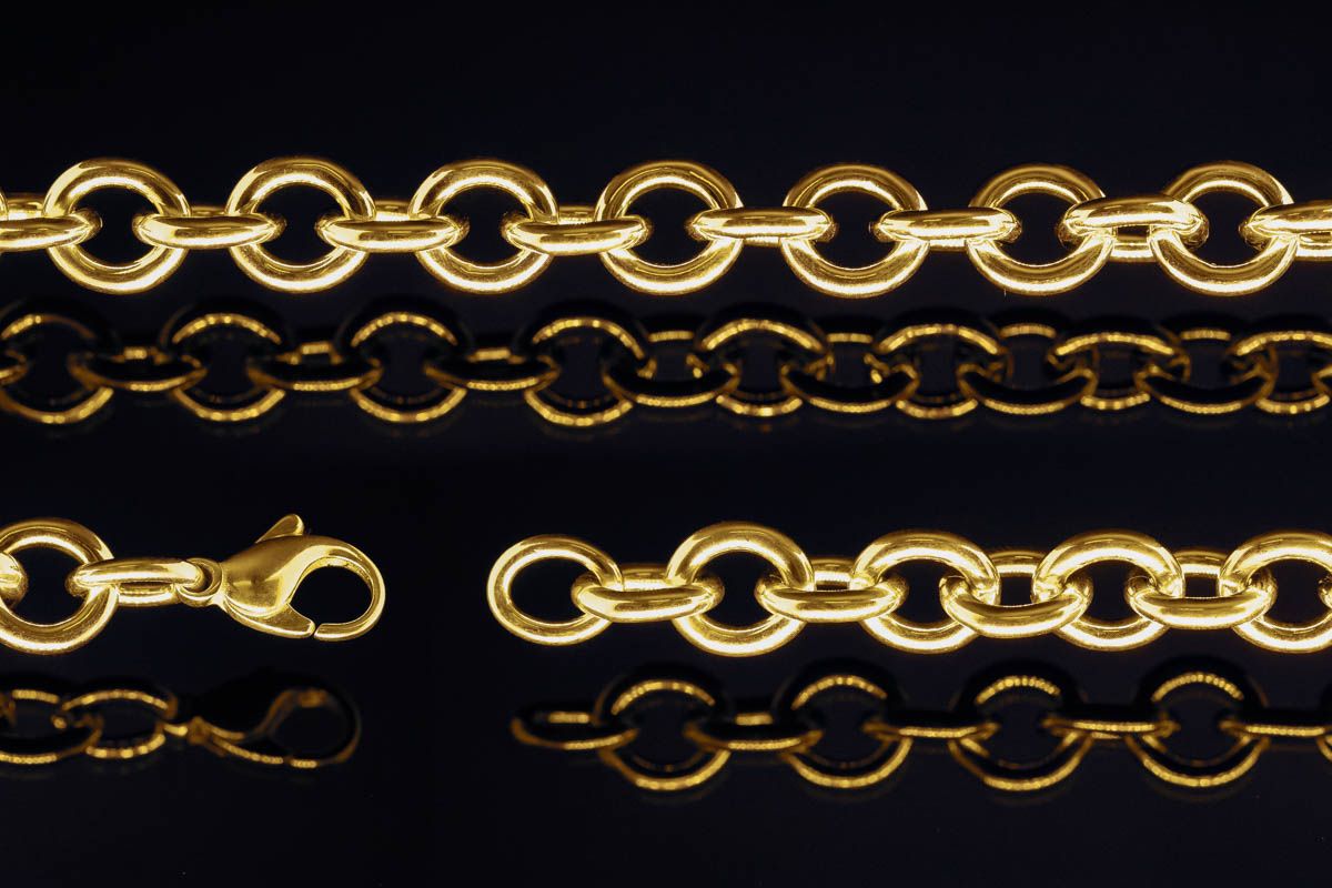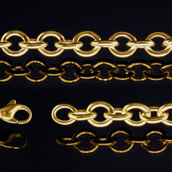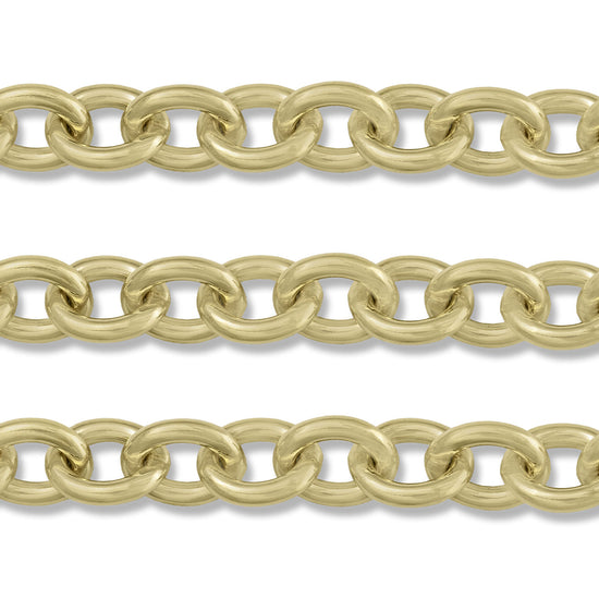 A heavy cable chain, featuring bold extra-large links (9.76mm x 10.95mm) crafted from robust 2.20mm wire. This chain is ideal for creating statement pieces and unique, one-of-a-kind jewelry. The finished chain includes a 15mm lobster claw clasp and jump rings for easy closure. Available in 14K or 18K gold. Please note that tags are not included.