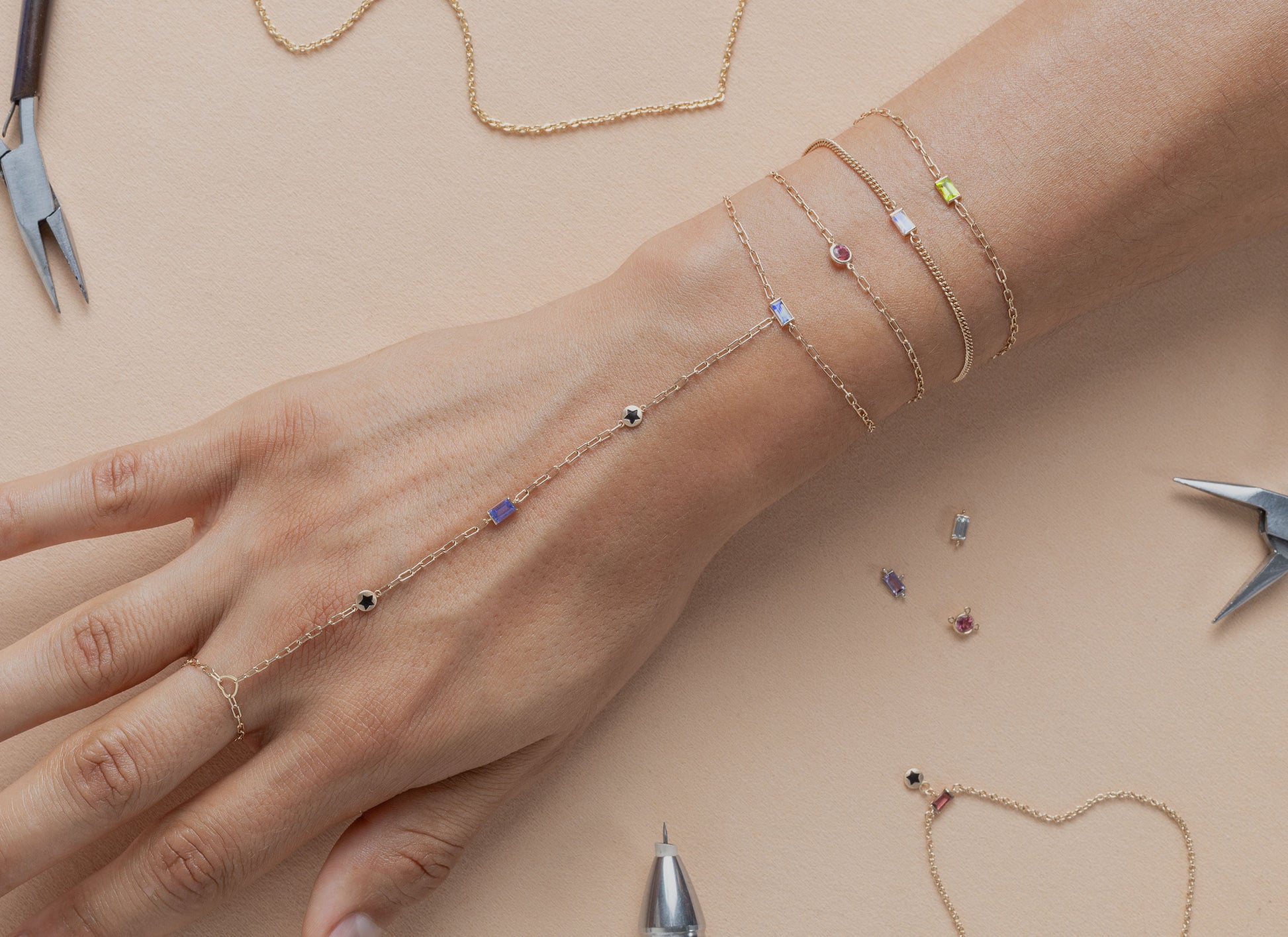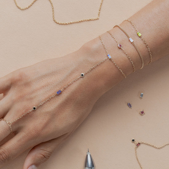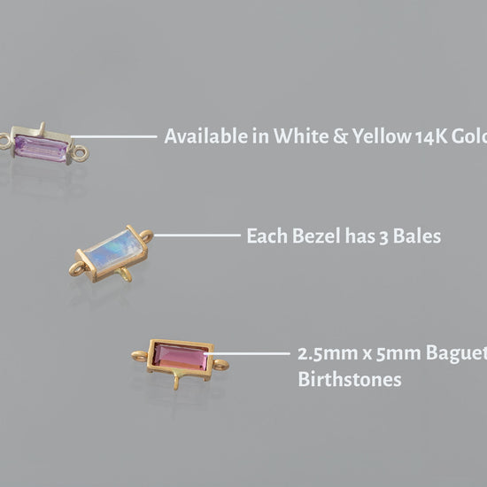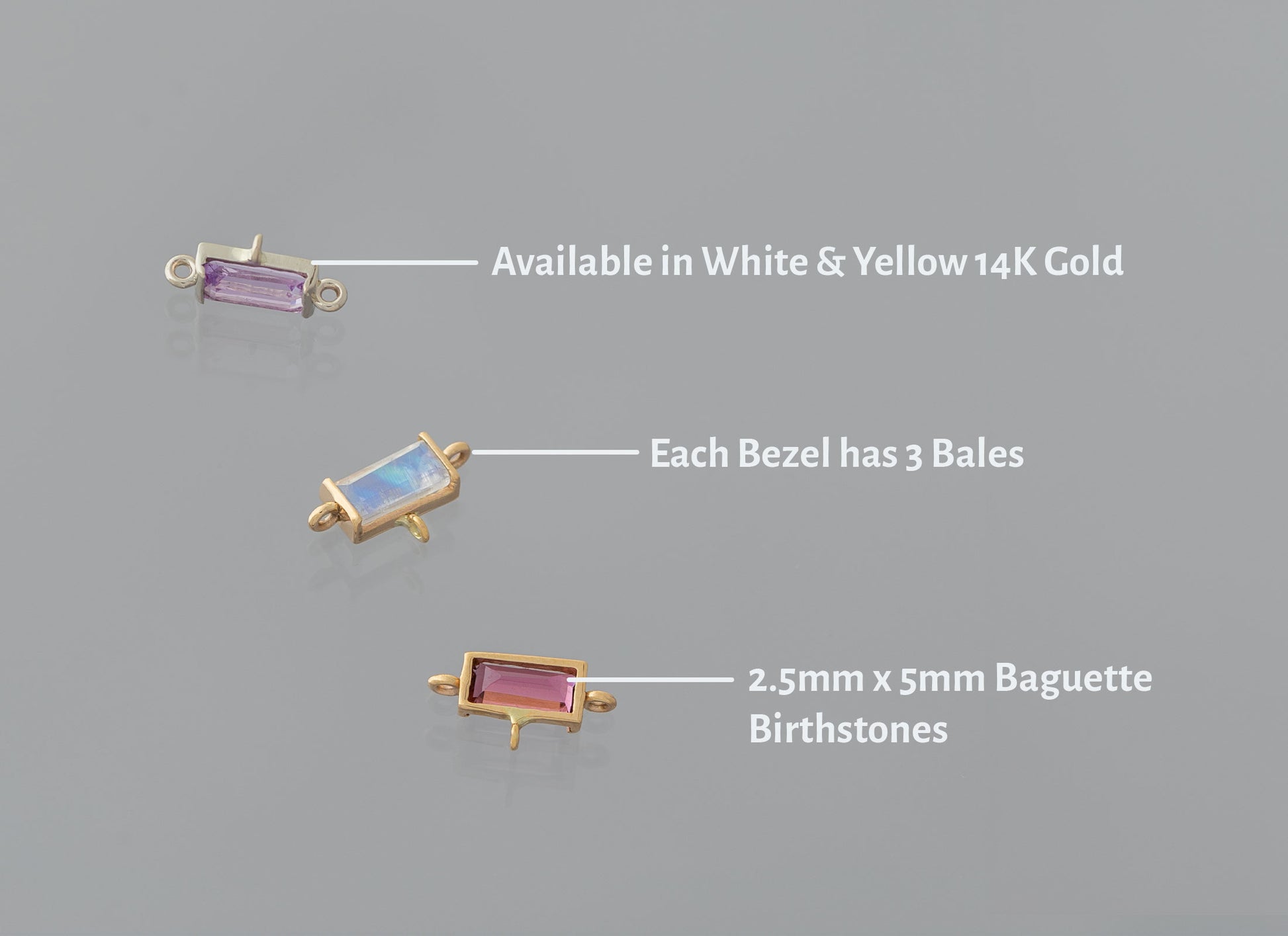 Introducing RIVA’s 14K Gold Hand Chain Baguette Birthstone Connector, designed with three bails—two on the sides and one on top—for versatile jewelry designs. Featuring 2.5mm x 5mm baguette birthstones with a closed-back setting, this elegant connector ensures full stone coverage and comfortable wear. Perfect for creating personalized bracelets, necklaces, or custom jewelry pieces.